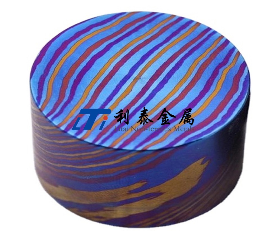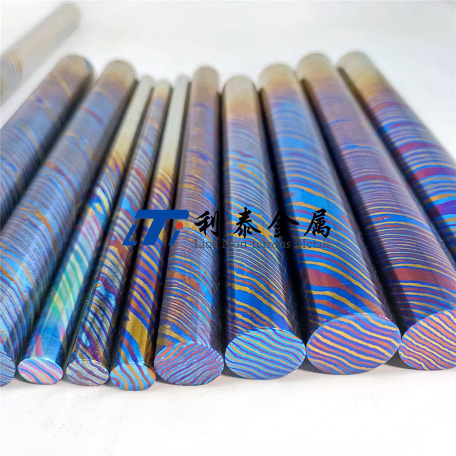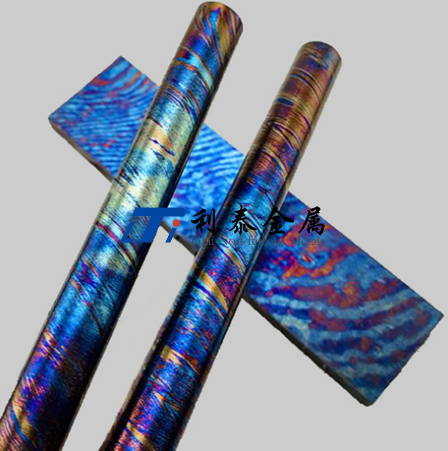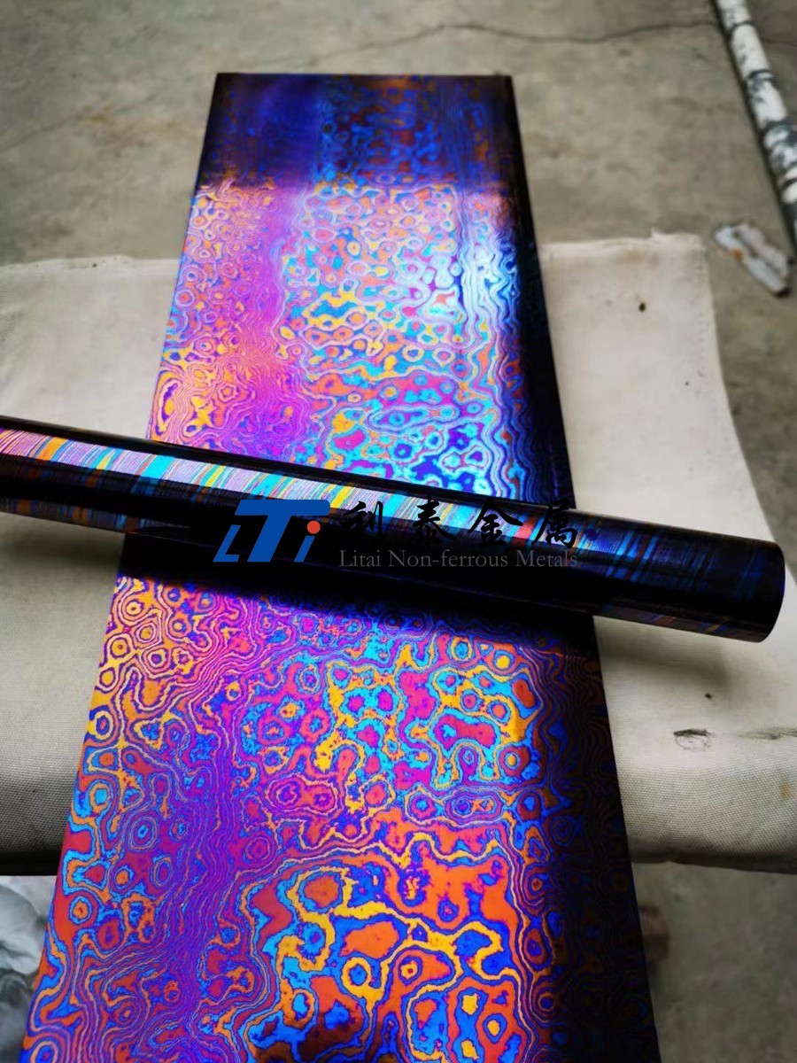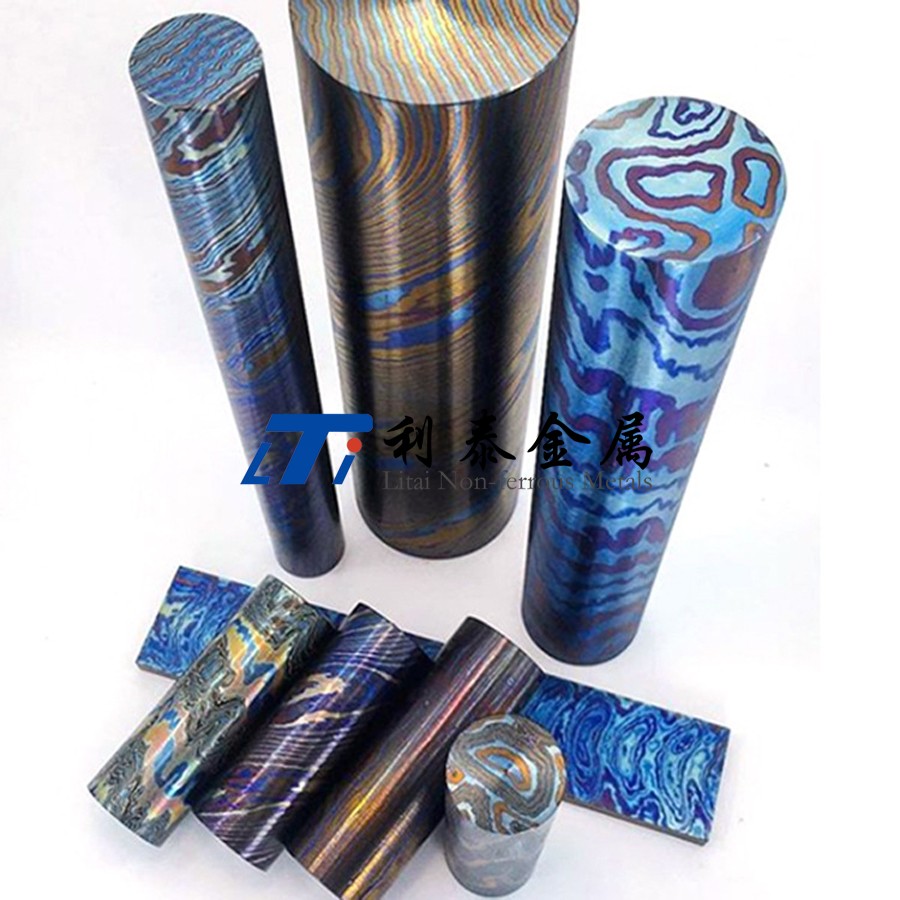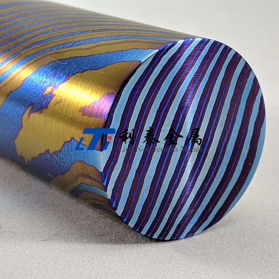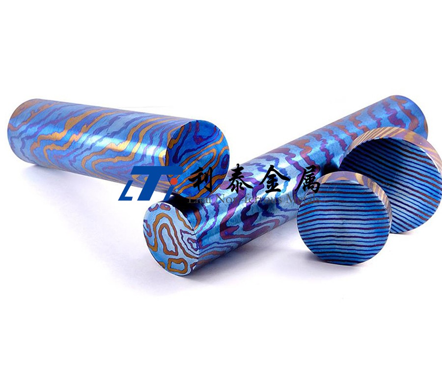 鈦馬士革是由兩種或兩種以上的鈦合金疊鍛而成。然后通過熱處理(鈦燒藍(lán))或者陽極氧化,形成不同的顏色分層的鈦合金材質(zhì)。