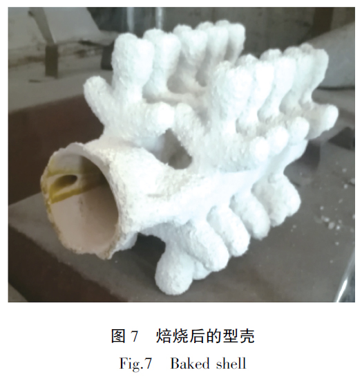 樹(shù)脂模在焙燒過(guò)程中容易發(fā)生膨脹脹裂型殼,本工藝樹(shù)脂模因其表面涂有蠟,預(yù)熱溫度60℃時(shí)蠟已經(jīng)開(kāi)始融化,使模型與殼之間產(chǎn)生了間隙,徹底解決了因樹(shù)脂焙燒膨脹而對(duì)模殼產(chǎn)生的脹裂問(wèn)題。樹(shù)脂模必須采用天然氣爐焙燒,樹(shù)脂在天然氣爐中瞬間燃燒消失減少了其因膨脹而對(duì)型殼損壞。圖6 為天然氣焙燒爐,圖7 為焙燒后的型殼。制好的的型殼組盤(pán)后即可澆注,澆注好的鑄件如果是重量輕、壁厚薄的鑄件其表面污染層薄,無(wú)需專(zhuān)門(mén)去除,經(jīng)過(guò)熱等靜壓、精整和包裝后即可發(fā)給客戶(hù)。