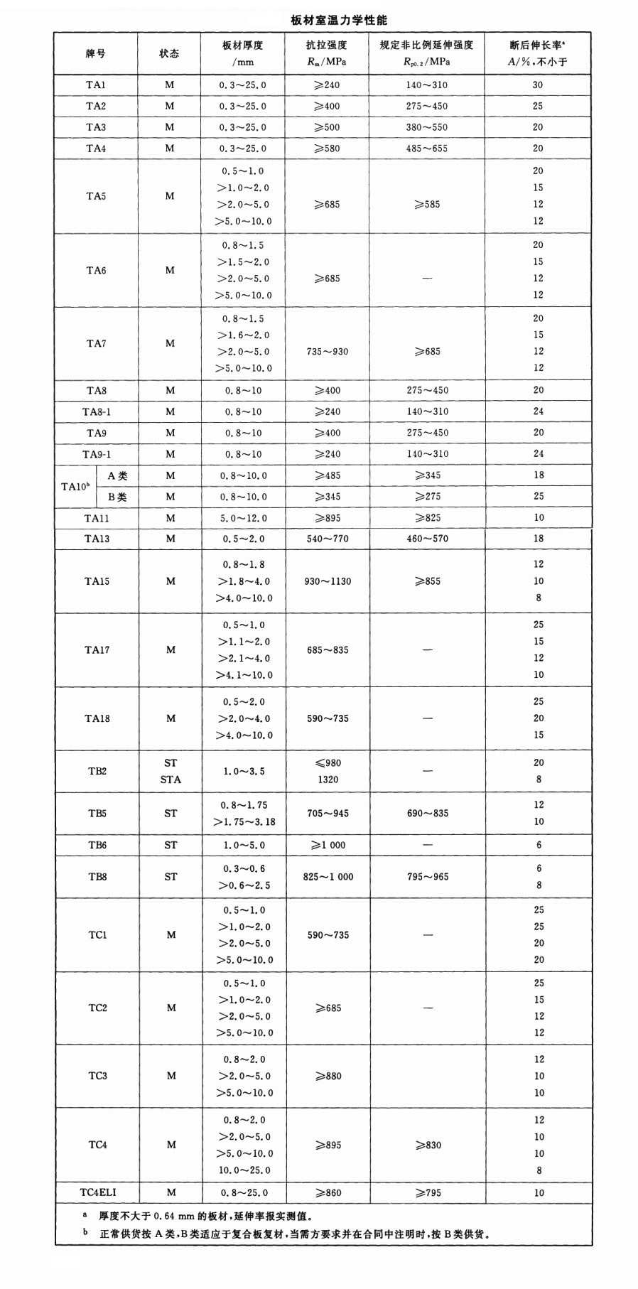 鈦合金板類型的鈦具有密度小、耐高溫、耐腐蝕等特性。鈦合金強度高,大量用于制造軍用超音速飛機的結(jié)構(gòu)部件,也用于制造火箭發(fā)動機殼體、人造衛(wèi)星殼體等,還可用于制造船舶及潛艇的各種部件。用鈦合金制造火炮、坦克等,既能減輕重量,又很耐用。通常使用抗拉強度表示鈦材的室溫性能,GB/T3621一2007標準中對鈦合金板材橫向室溫力學(xué)性能規(guī)定如下:
